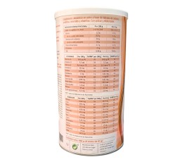 Complemento alimenticio en polvo a base de hidratos de carbono, proteínas, minerales y vitaminas. Con azúcar y edulcorante.